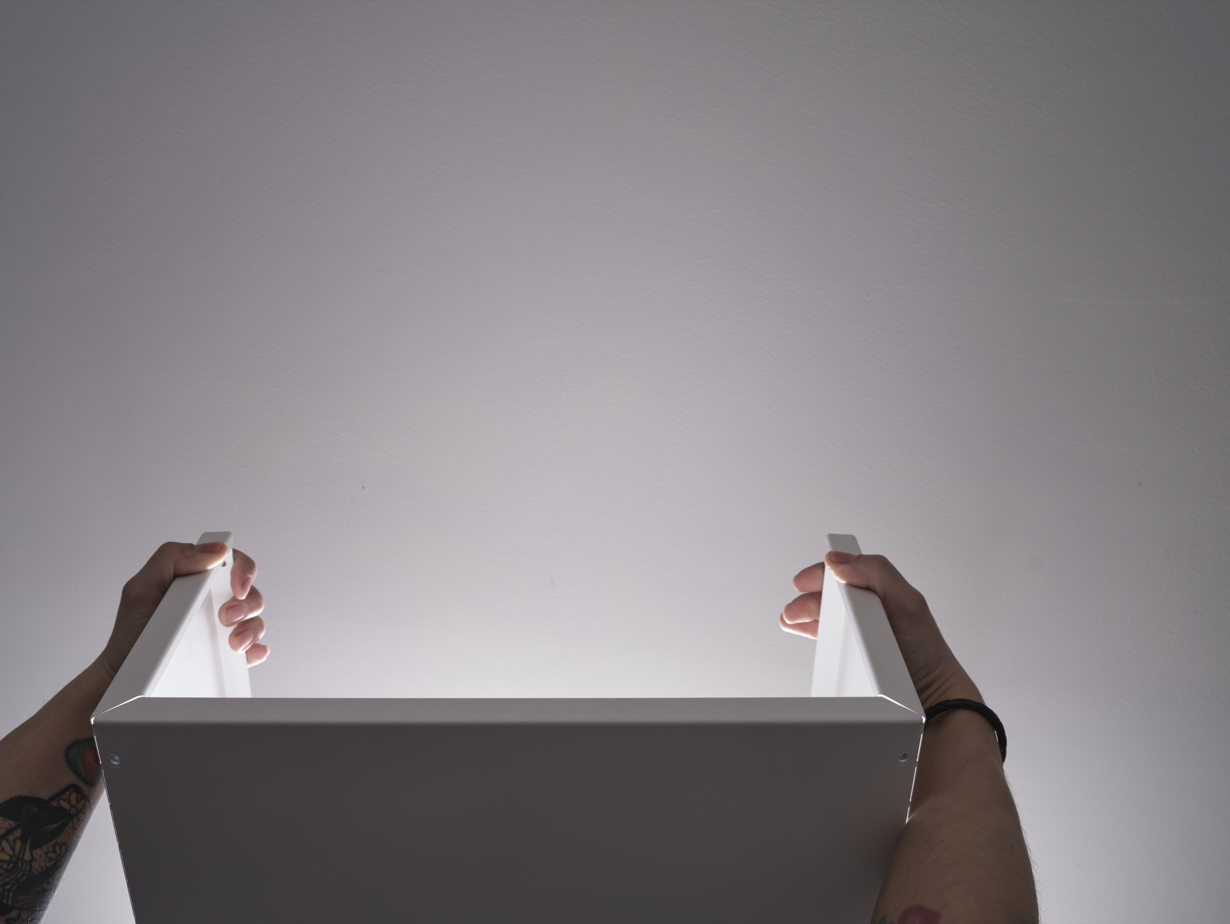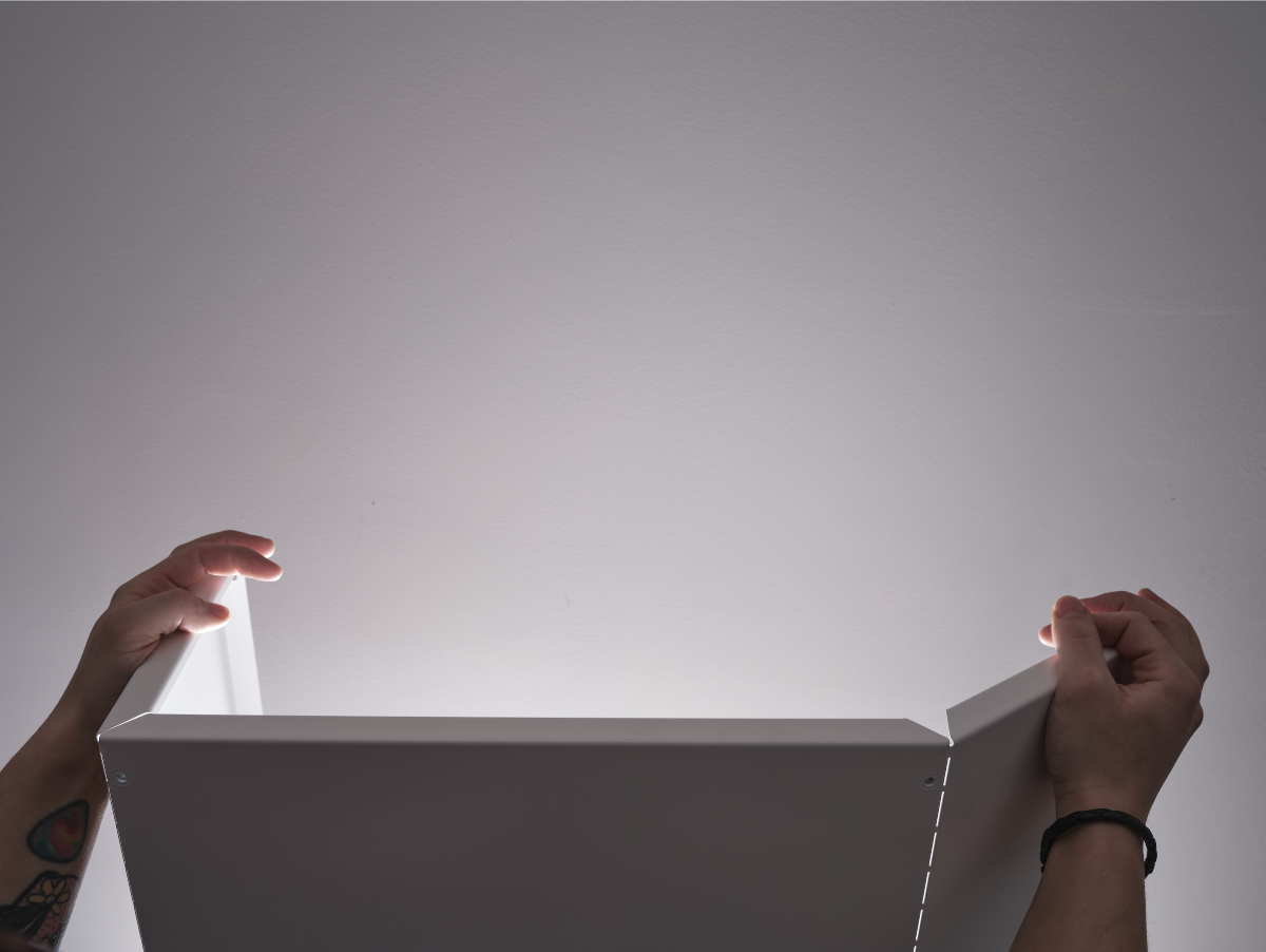 Il sistema a incastro studiato dal designer consente un montaggio senza bisogno di fissaggio a parete, in cui le lastre vengono piegate manualmente andando a formare una sorta di ‘C’ e i cui angoli vengono poi bloccati all’interno grazie ai magneti.
