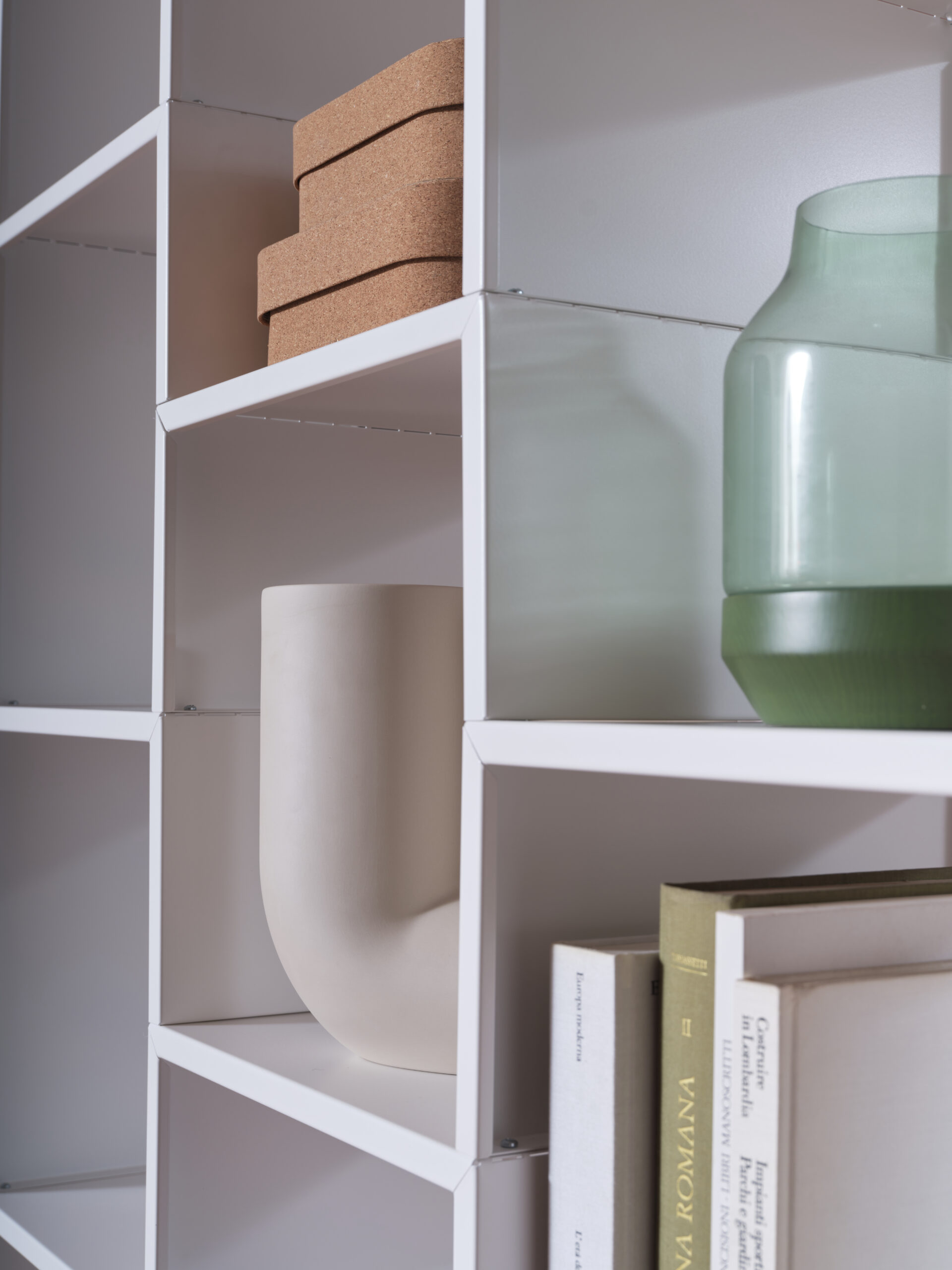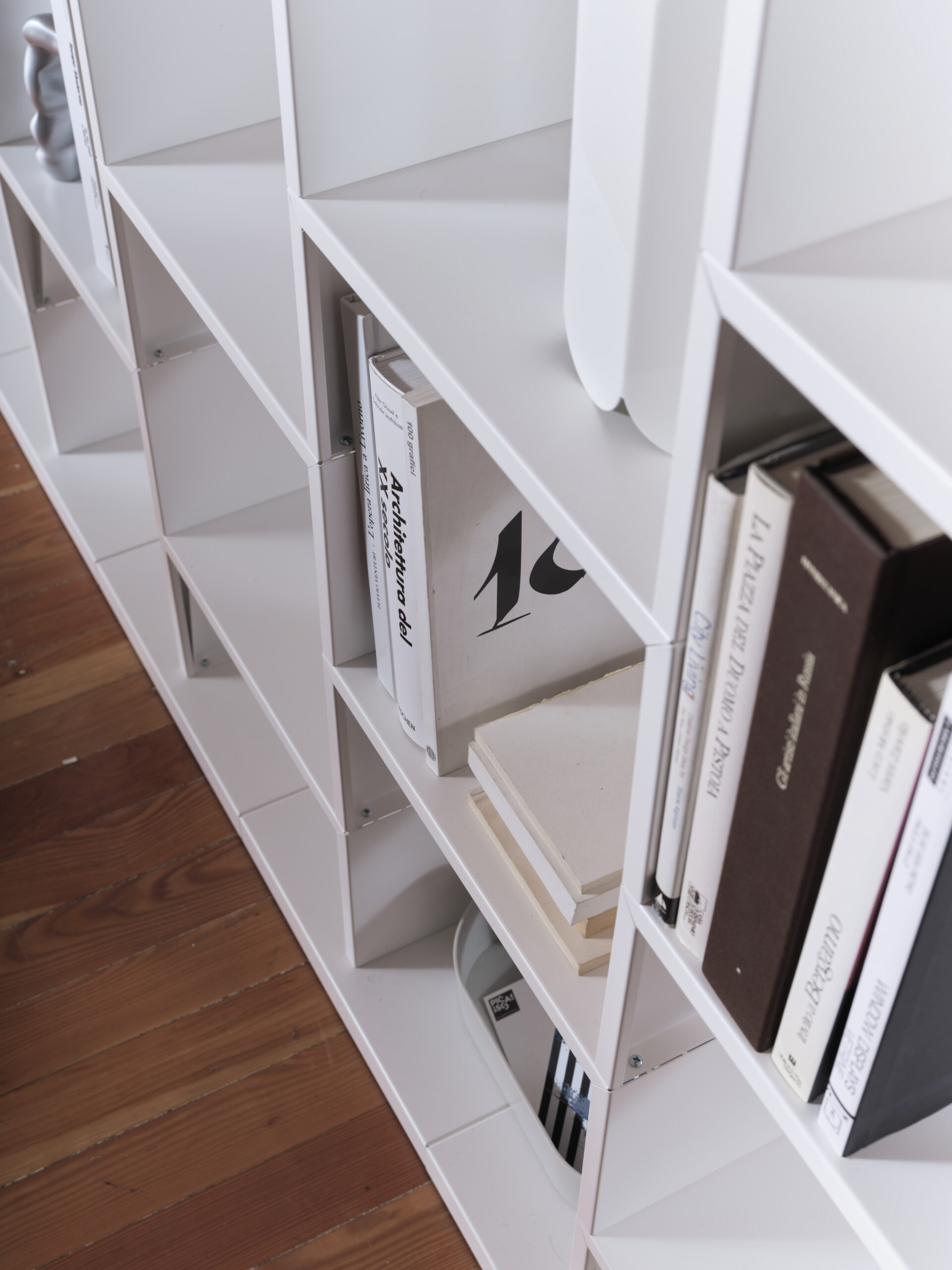 Pensata come elemento freestanding, la libreria può essere posizionata in qualsiasi ambiente, crescendo in altezza e in larghezza in base alle necessità e, al tempo stesso, avere dimensioni di imballo incredibilmente compatte.