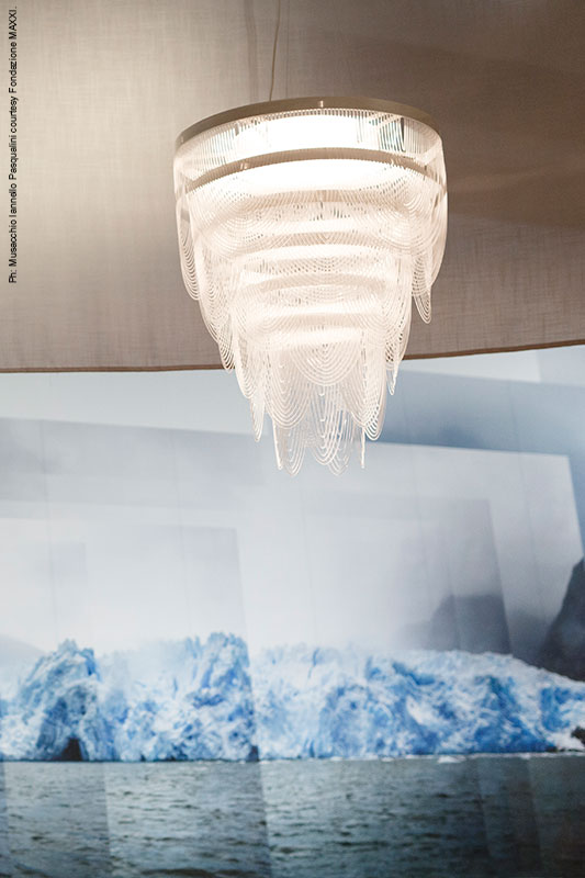Se a novembre 2017 il progetto vedeva al centro le collezioni Chantal di Fuksas, quest’anno la visionaria architettura progettata da Zaha Hadid è stata “vestita” con i drappeggi romantici e femminili di Ceremony Prisma, la sospensione opulenta e scenografica firmata dal genio di Bruno Rainaldi nel 2009.